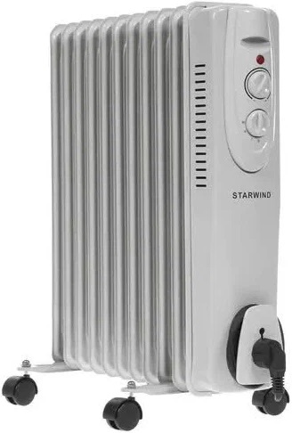 Масляный радиатор Starwind SHV3120 конструкцией которого предусмотрено 11 секций, благодаря чему он справится с эффективным увеличением температуры в помещениях площадью до 40 кв. м. Прорезиненные ролики в основании незаменимы для быстрого перемещения устройства без вреда для напольного покрытия.