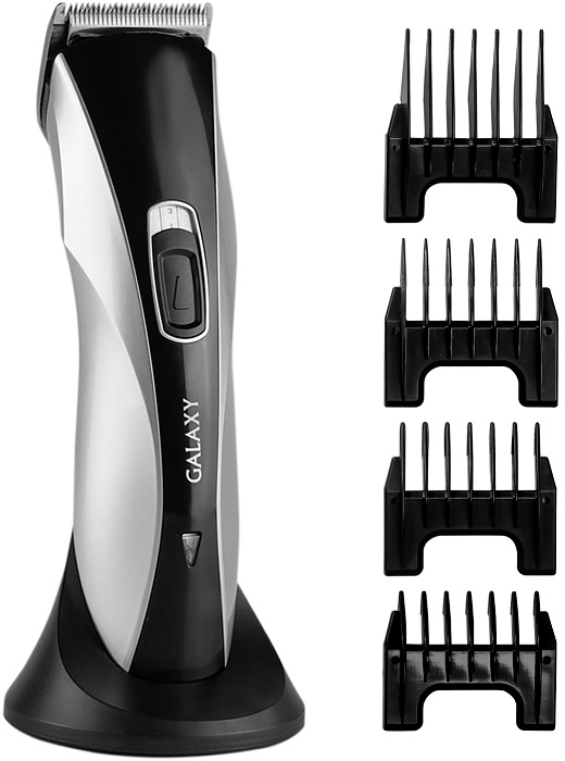 Комплект Galaxy GL4155 предусматривает 4 насадки, позволяющие вам создать на голове желаемую вами стрижку. Установок длины в данной модели предусмотрено 7, настраиваемых при помощи смены насадок и специального регулятора. Лезвия изготовлены из нержавеющей стали, благодаря чему эта машинка прослужит вам очень долго без необходимости заточки. Предусмотрена возможность филировки прически. Конструкция данной модели включает в себя индикатор работы и заряда. В комплекте присутствует специальная подставка для удобной подзарядки устройства.