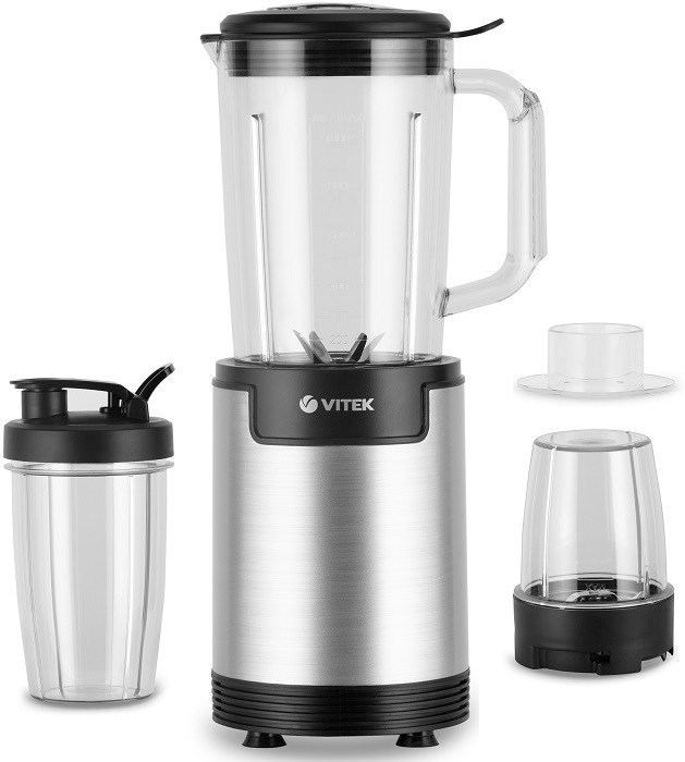Блендер Vitek VT-8528 – предельно простой прибор для взбивания коктейлей, приготовления пюре и измельчения твердых продуктов. Он комплектуется тремя чашами: на 1 л, 500 и 350 мл. Такой набор позволяет подобрать подходящую емкость для каждой цели. Например, для того, чтобы смолоть кофе, лучше подойдет самая маленькая, а для молочного коктейля – самая большая.