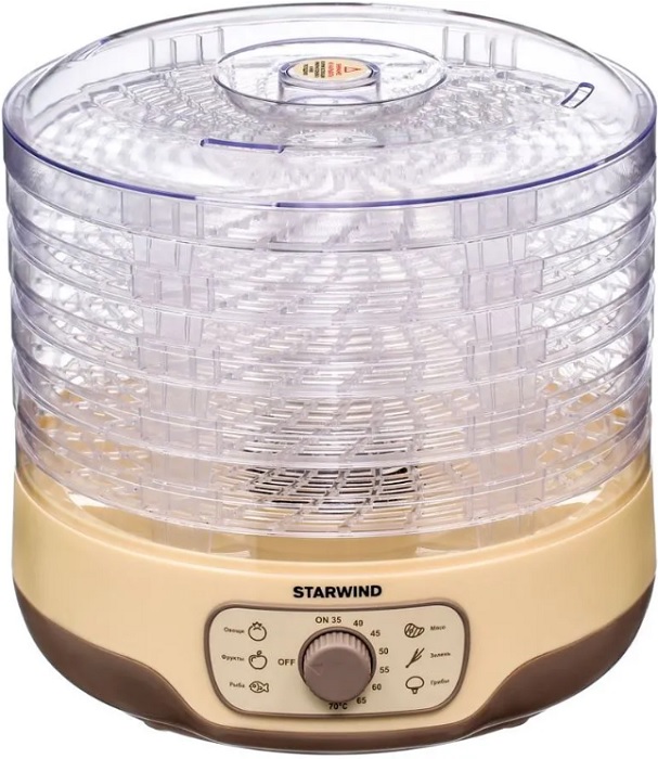 Сушилка для овощей и фруктов Starwind SFD2520 благодаря встроенному вентилятору и нагревательному элементу равномерно распределяет тепло в принудительном режиме, обеспечивая сушку порезанных ломтиков продуктов с сохранением полезных веществ. Она подходит для сушки овощей, фруктов, ягод, трав, зелени и других продуктов. В зависимости от продуктов можно регулировать температуру сушки с помощью поворотного переключателя. Сушилка оснащена 5 поддонами из прозрачного пластика с вместимостью 0.6 кг. На основании Starwind SFD2520 расположены ножки для повышения устойчивости.