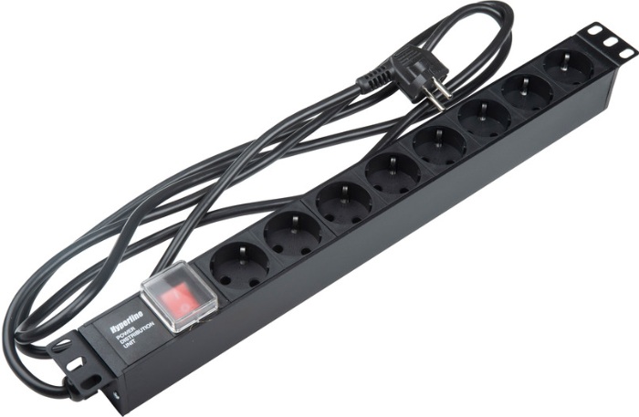 Горизонтальный блок розеток Hyperline SHE19-8SH-S-2.5EU предназначен для монтажа в 19-дюймовые шкафы, занимает 1U. Устройство оснащено 8 розетками типа Schuko на 16 А / 250 В, выключателем с подсветкой и кабелем питания длиной 2,5 м (3×1,5 мм²) с вилкой Schuko.