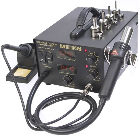 Текущая температуру нагрева паяльных инструментов отображает ЖК-дисплей паяльной станции Мегеон 00522. Паяльник имеет клиновидное жало и допускает его быструю замену, а фен для пайки поддерживает смену насадок. Питание прибора, выполненного в настольном форм-факторе, осуществляется от бытовой сети 220 В.