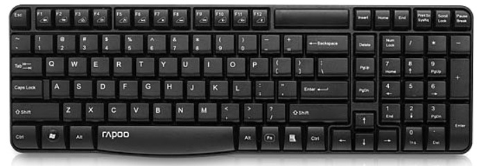 Клавиатура RAPOO E1050 соединяется с компьютером посредством радиоканала частотой 2.4 Гц. Приемник сигнала подключается через интерфейс USB. В устройстве имеются 104 кнопки стандартного типа, а многофункциональность обеспечивается за счет наличия дополнительной клавиши "Fn". Значки дополнительных возможностей указаны на кнопках F1-F12. В модели отсутствуют световые индикаторы.