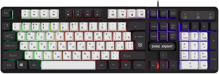 Клавиатура Defender Dark Knight GK-077 RU (45078); мембранная; 12 FN клавиш; RGB-подсветка; влагозащита; USB; черный/белый