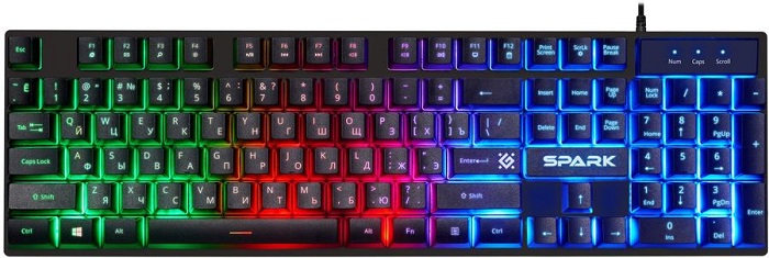 Клавиатура Defender Spark GK-300L с классической черной расцветкой корпуса выглядит эффектно и может использоваться даже в темноте благодаря многоцветной подсветке клавиш и символов. Устройство подходит не только для игр, но и для повседневной работы за компьютером. В конструкции данной модели присутствует полноценный цифровой блок, который пригодится при вычислениях и работе с большими массивами числовых данных. Для подключения клавиатуры к компьютеру используется 1.5-метровый кабель с интерфейсом USB.