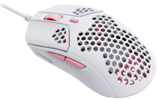 Мышь проводная HyperX Pulsefire Haste оформлена в белом корпусе с элементами розового цвета. Перфорация на корпусе уменьшает вес устройства, пропускает лучше воздух, обеспечивая его микроциркуляцию. Подключается модель при помощи кабеля длиной 1.8 м с разъемом USB Type-A. Тканевая оплетка кабеля не допускает его повреждения. Особенность манипулятора в поддержке RGB-подсветки.