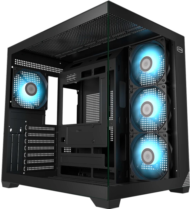 PCcooler C3 T700 ARGB BK — это полнофункциональный корпус среднего размера (midi-tower) с продуманной организацией пространства и эффективным охлаждением. Корпус доступен в строгом чёрном цвете с использованием закалённого стекла на передней и боковых панелях, создающих прозрачный обзор внутренних компонентов.Предназначен для установки материнских плат форматов ATX/mATX/mini-ITX и поддерживает крупные комплектующие: видеокарту длиной до 400 мм и процессорный кулер высотой до 175 мм. Возможность вертикального расположения накопителей и широкая поддержка вентиляторов различного диаметра (до 140 мм) позволяют создать оптимальную циркуляцию воздуха и минимизировать нагрев компонентов. В комплект входят четыре вентилятора с ARGB-подсветкой, управляемой через совместимые материнские платы.На передней панели расположены интерфейсы USB 2.0, USB 3.0, USB Type-C и аудиовыходы. Корпус оснащён пылевыми фильтрами, что обеспечивает долговременную эксплуатацию без потерь производительности. Толстые стенки толщиной 0,7 мм обеспечивают прочность и надёжность конструкции.