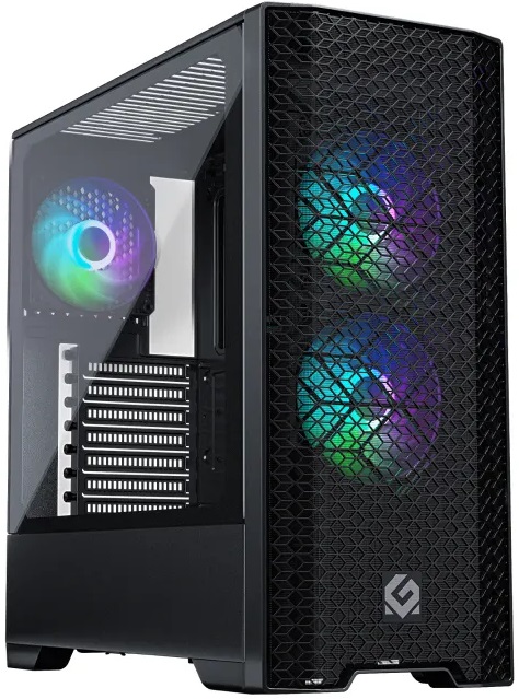Передняя панель корпуса – перфорированная. Это помогает добиться необходимой эффективности отвода теплого воздуха. Блока питания в комплекте нет. Данный элемент конструкции ПК нужно будет установить снизу. Особенность дизайна корпуса – наличие адресной ARGB-подсветки.