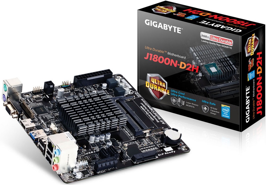 Материнская плата GigaByte GA-J1800N-D2H обладает встроенным процессором Intel Celeron J1800 и возможностью установки оперативной памяти объемом до 8 Гб. Данная модель отличается непревзойденным качеством материалов и технологических процессов производства на всех этапах разработки и создания материнской платы. GigaByte использует только твердотельные конденсаторы и полевые транзисторы Low RDS(on) с пониженным сопротивлением канала, способные работать при высоких температурах на протяжении более 50.000 часов.