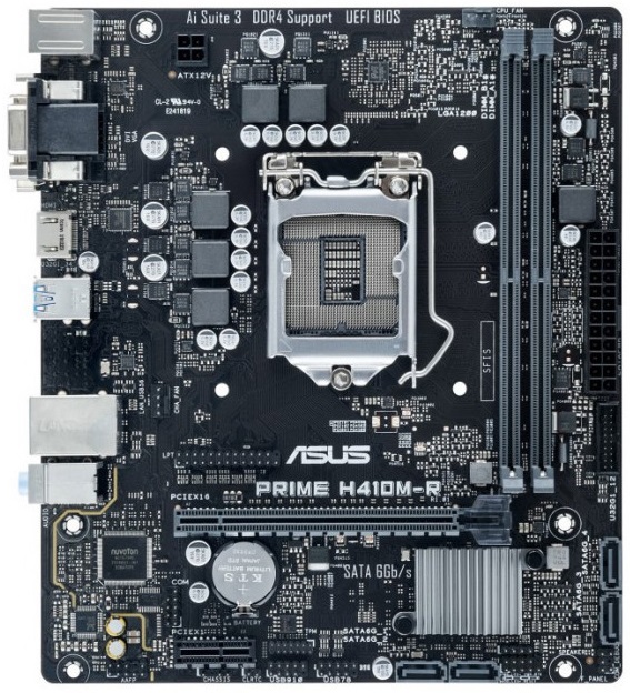 Материнская плата ASUS PRIME H410M-R-SI принадлежит к форм-фактору Micro-ATX и обладает размерами 226x203 мм (высота и ширина соответственно). Для подключения процессора используется сокет LGA 1200. Чипсет представлен моделью Intel H410, предусматривающей BIOS AMI. Для установки модулей оперативной памяти имеются два слота, поддерживающих форм-фактор DIMM-DDR4. Максимальная частота ОЗУ достигает 2933 МГц. Максимальный объем устанавливаемой оперативной памяти не должен превышать 64 ГБ.