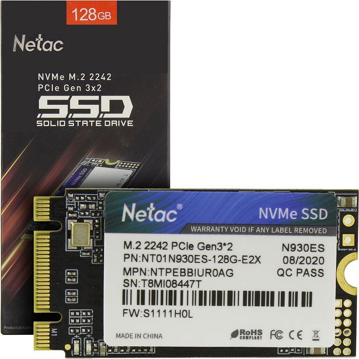 SSD-накопитель M.2 NVMe 128Гб Netac N930ES (NT01N930ES-128G-E2X); 1650/1500 МБ/сек; 1.5 млн.ч; Silicon Motion SM2263XT; 3bit TLC 3D NAND