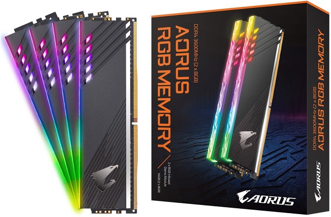 Планки памяти DDR4 от AORUS - игрового бренда GIGABYTE. Вариация: 2 x 8 ГБ с частотой работы 3600 МГц, таймингами 18-19-19-39 и напряжением работы 1,35 В. Среди прочего строит отметить радиаторы из довольно толстого алюминия (2 мм), особое напыление радиаторов, предотвращающее появление царапин, ну и конечно RGB-подсветку.