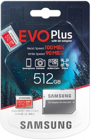 Карта памяти microSDXC 512 ГБ Samsung EVO Plus (MB-MC512HA/RU); Class10,UHS-I,U3; 100/90 Мб/с; адаптер на SD