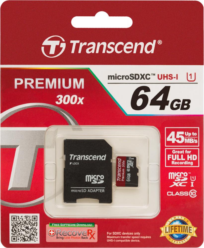 Карта памяти microSDXC 64 ГБ Transcend Premium 300x (TS64GUSDXC10); Class10,UHS-I; 45 Мб/с; адаптер на SD