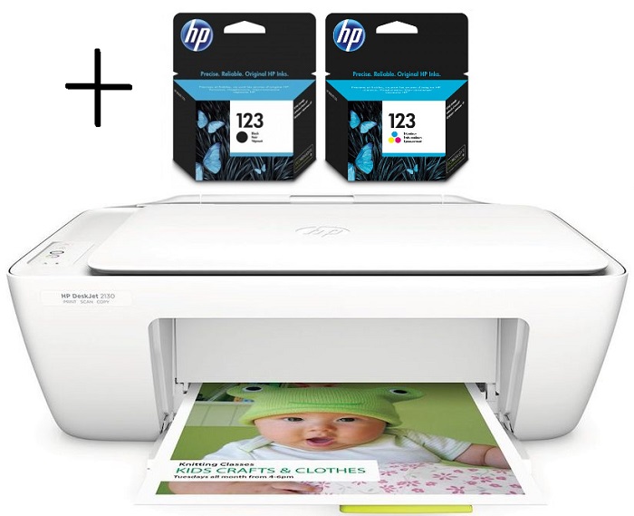МФУ HP Deskjet 2130 (+ комплект картриджей HP №123); 4800x1200 dpi; 1200x1200 dpi; 7.5/5.5 стр/мин; №123; белый
