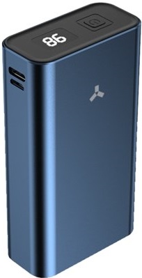 Портативная зарядка весит всего 190 г при компактных габаритах — меньше 9 см в длину и 5 см в ширину. Такой гаджет легко помещается в карман. Кроме того, в синий обтекаемый корпус встроен дисплей, на котором отображается остаток заряда батареи в процентах.